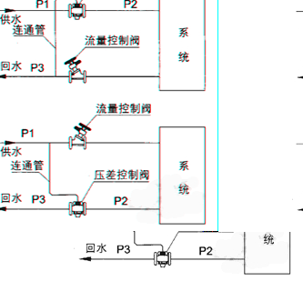 現以安裝在回水管道上的ZYC型自力式壓差控制閥為例說明工作原理。當供水壓力p1增大或減小時,信號由連接管傳如膜片上腔,帶動閥芯下移,使閥座的流通面積減小或增大。P2-P3也增大或減小,直到P1-P2保持原值恒定。當回水壓力P3增大或減小的瞬間同閥座流向出口的流速降低或升高,膜片下壓力P2也在這個瞬間增高或降低,帶動閥芯上移或下移,知道膜片的受力重新平衡,P2恢復原值,P1-P2保護原值恒定,從而保證了被控系統的供回水間壓差基本不變。