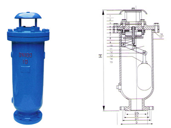 污水復(fù)合式排氣閥原理與復(fù)合式排氣閥相同,只是將結(jié)構(gòu)略作改動(dòng),即將閥體加長(zhǎng),杠桿結(jié)構(gòu)稍微改動(dòng)。這樣將控制部分降低,使污物只在閥體下部,不會(huì)纏繞上部排氣部分個(gè)結(jié)構(gòu),不影響排氣,不致水漏。