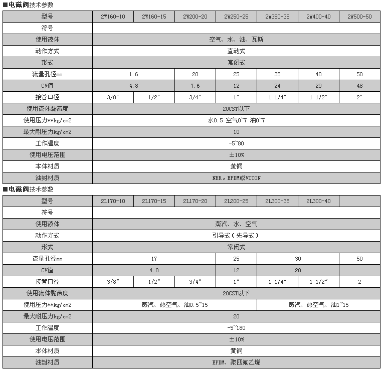 2W系列電磁閥,閥體采用鍛壓成型,內(nèi)件不銹鋼制作,用于管路中對液體,氣體介質(zhì)通斷的自動控制。兩口兩位直動式電磁閥,斷電打開,通電關(guān)閉閥體材質(zhì)為銅,最大耐壓使作壓力:17kgf/cm2環(huán)境溫度:0℃~65℃產(chǎn)品系列化生產(chǎn),體積小,流量大,適用范圍廣按閥上所表流向箭頭,可任意安裝;為增強(qiáng)使用壽命,最好線圈向上,水平安裝。